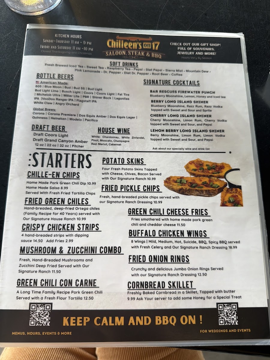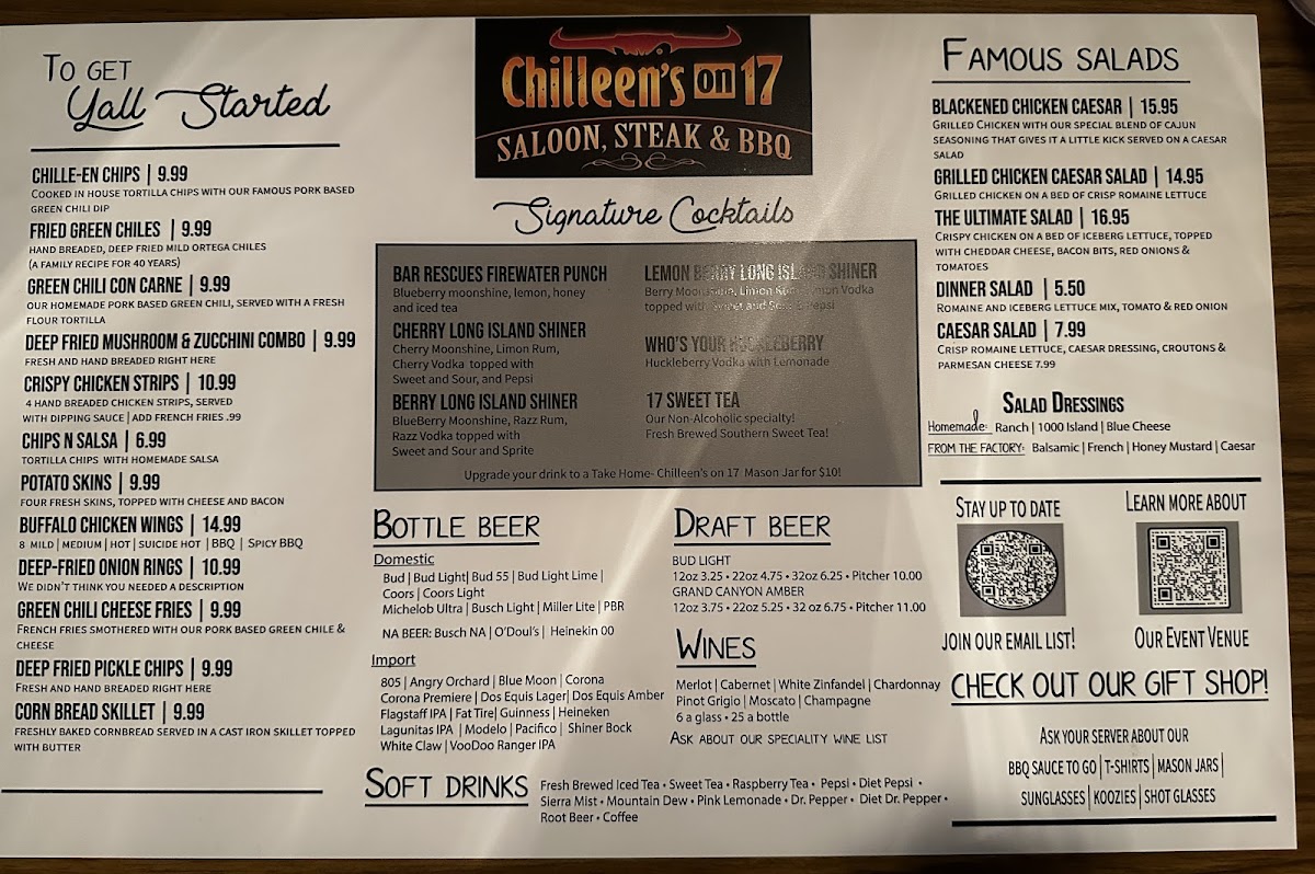 Chilleen's on 17 offers a menu that feels like a relaxed blend of classic barbecue and hearty steakhouse fare, perfect for unwinding anytime you’re in the mood for comforting, well-crafted dishes. Whether you’re stopping by for a casual lunch, a laid-back dinner, or enjoying drinks with friends, the menu provides a variety of indulgent options that fit the welcoming, rustic atmosphere.